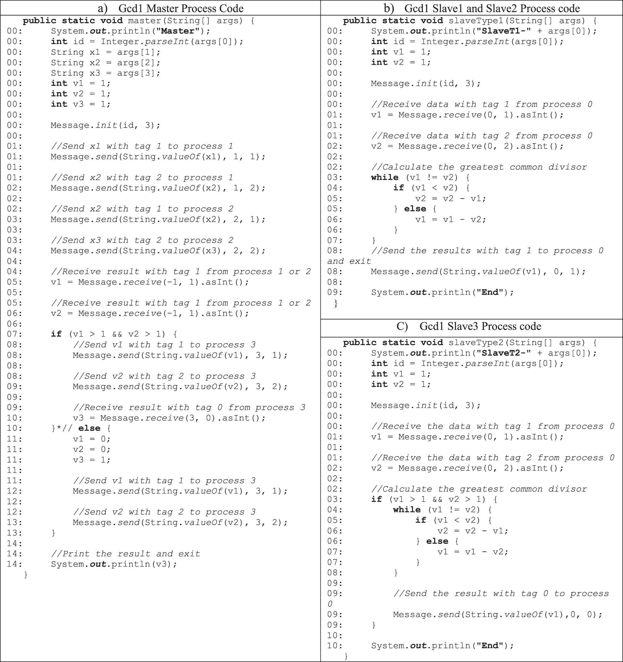 Gcd1 program: (a) master process, (b) slave1 and slave2 processes and (c) slave3 process.