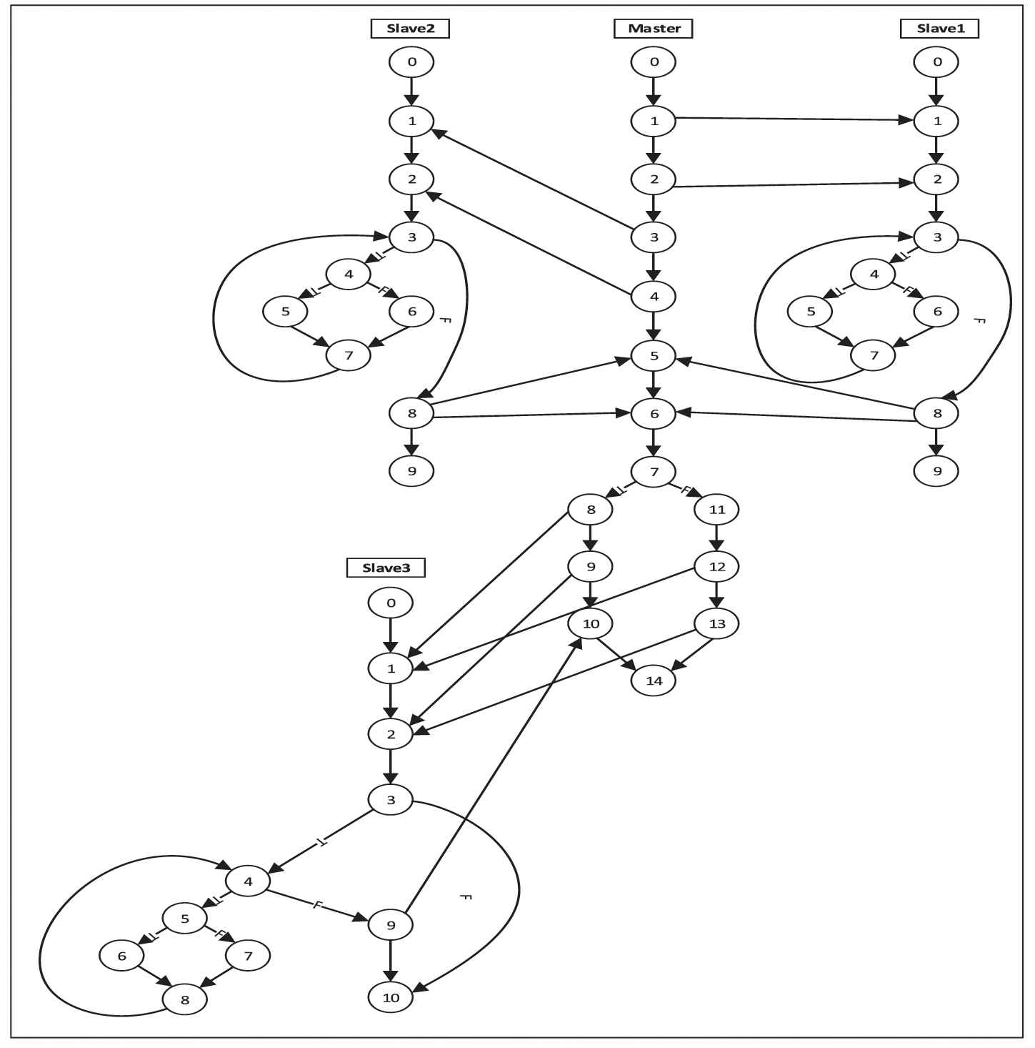 Figure 2 represents the PCFG of Gcd1. A control flow graph is drawn for every process of Gcd1 in PCFG. Each line of the source code is labeled with a number on the left side which represents the related node number in PCFG. Communications between processes are also represented with communication edges. For example, a communication edge (10, 11) is drawn between node 1 from the master process and node 1 from slave process 1.