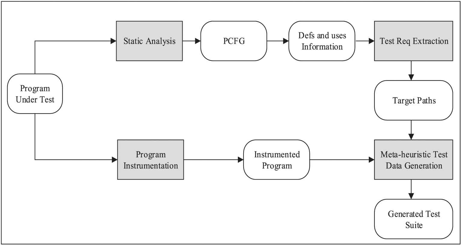 The overall framework is depicted in Figure 3. This framework consists of four main components: program instrumentation, static analysis, test requirements extraction and meta-heuristic test data generation. These components are described in Section 3.1.