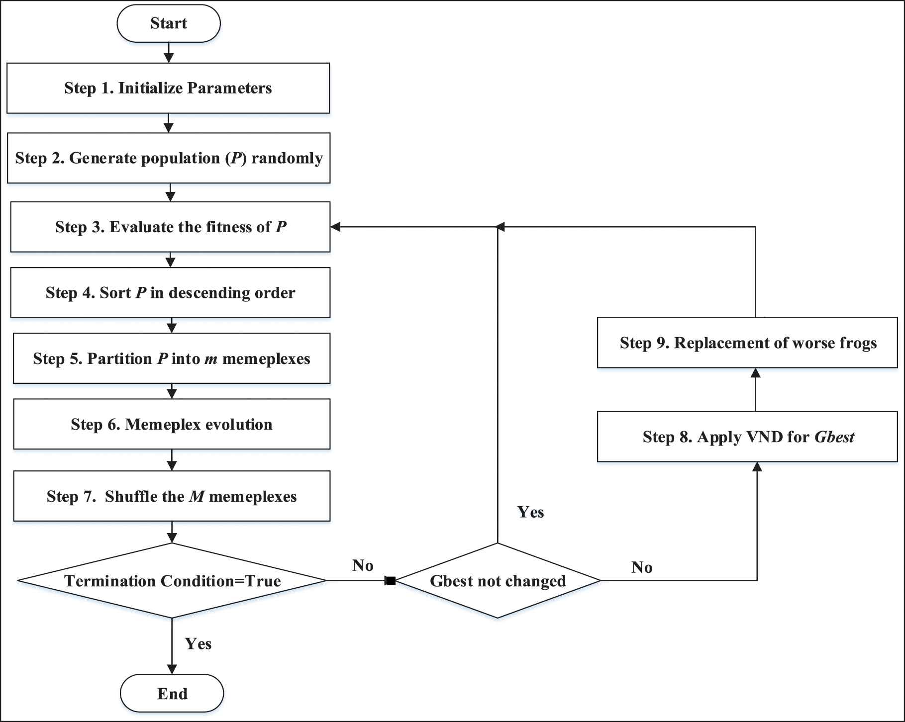 SFLA is a meta-heuristic optimization algorithm that mimics the memetic evolution of a group of frogs when seeking for the location that has the maximum amount of available food. This algorithm has shown its good performance in many optimization problems [7–9]. However, this algorithm may converge to a solution that is not the global optimum. To solve this problem, we combine SFLA with the VND algorithm in order to intensify the search and achieve a better solution. The VND algorithm will only be run if SFLA gets stuck in local optima. In this situation, VND receives the best solution produced by SFLA and tries to improve it. To do this, VND performs the search in the neighborhood of the best solution while the neighborhood domain increases during the search process. In addition, we utilize another technique, called replacement, to escape the algorithm from local optima. In the replacement stage, a percentage of elements with the lowest fitness are replaced by random elements.