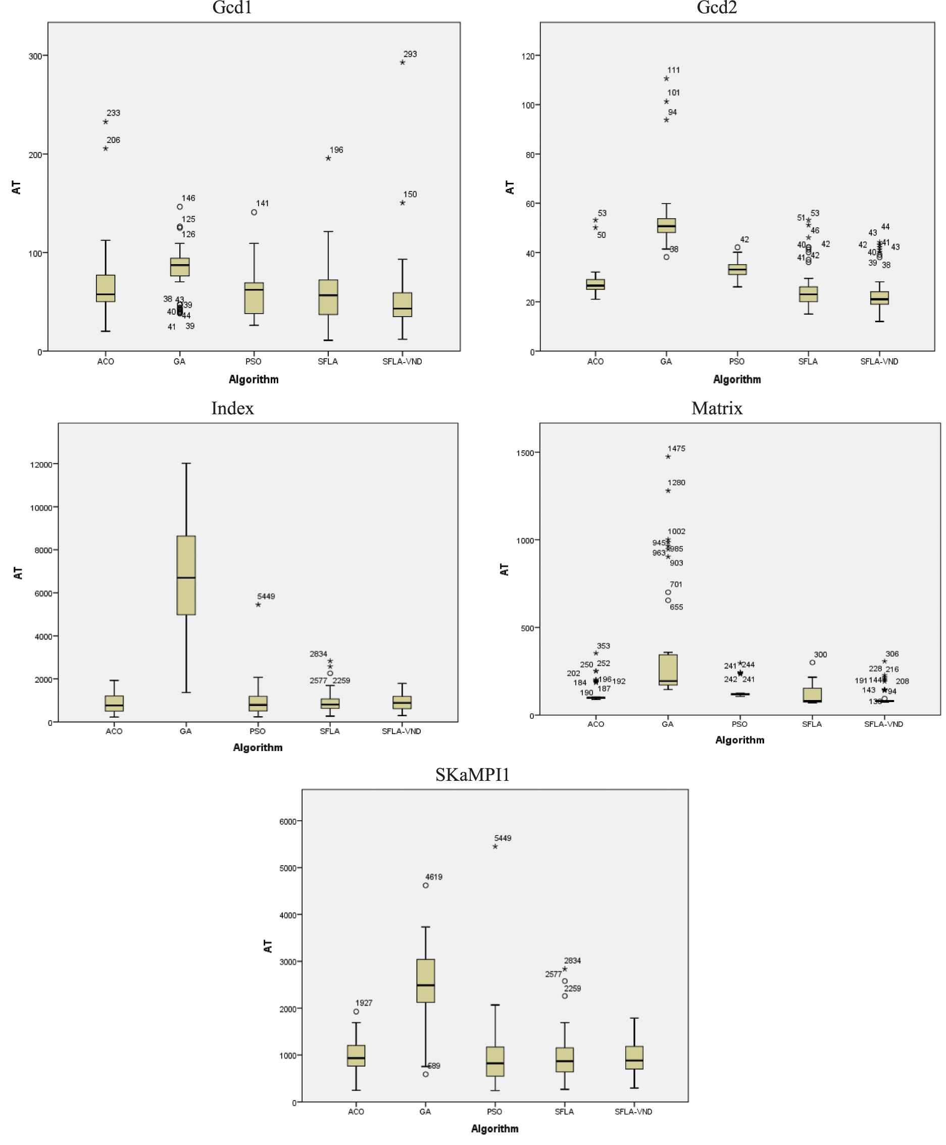 The Boxplot chart shown in Figure 6 is used to study and compare the distribution of the AT of different algorithms. It can be seen from the graph that for the two benchmarks Gcd1 and Gcd2, the values of the first, middle and third quartiles of SFLA-VND are less in comparison to the other compared algorithms. Regarding the Index benchmark, except for the GA, the distribution of four other algorithms is approximately the same. For SFLA-VND, the values of the first, middle and third quartiles are almost equal with respect to the Matrix benchmark. The values of these three quartiles in SFLA-VND are less than the corresponding values in the other algorithms. Also, the distribution of the ACO and PSO algorithms is similar to that of the SFLA-VND algorithm.