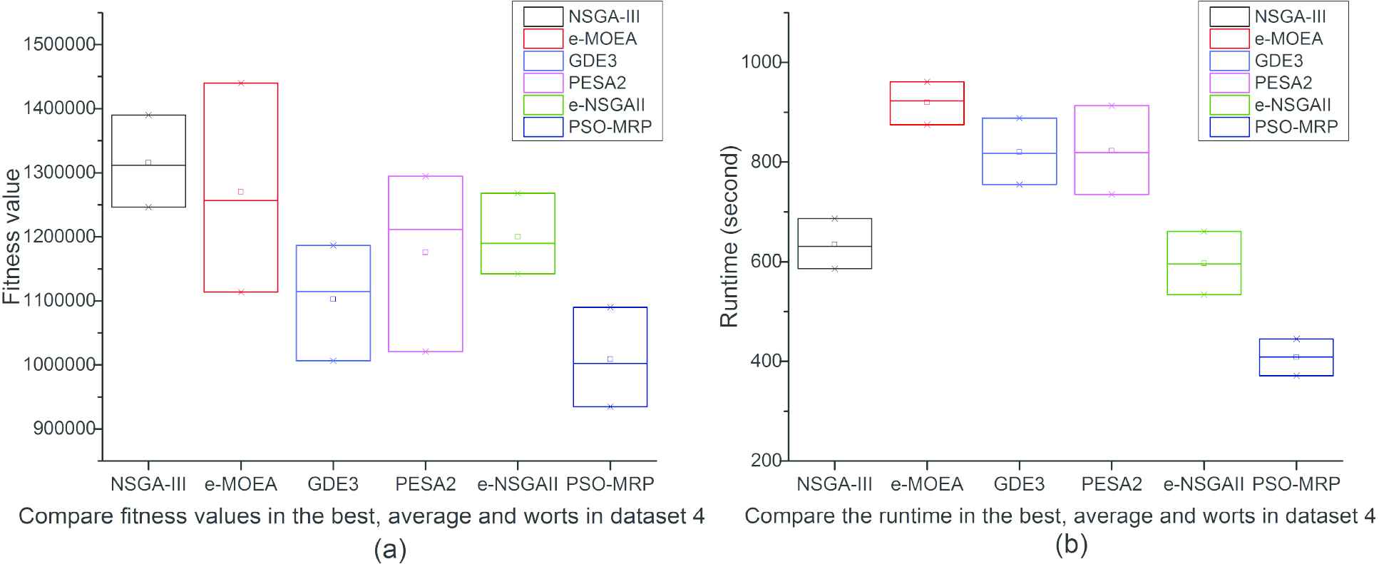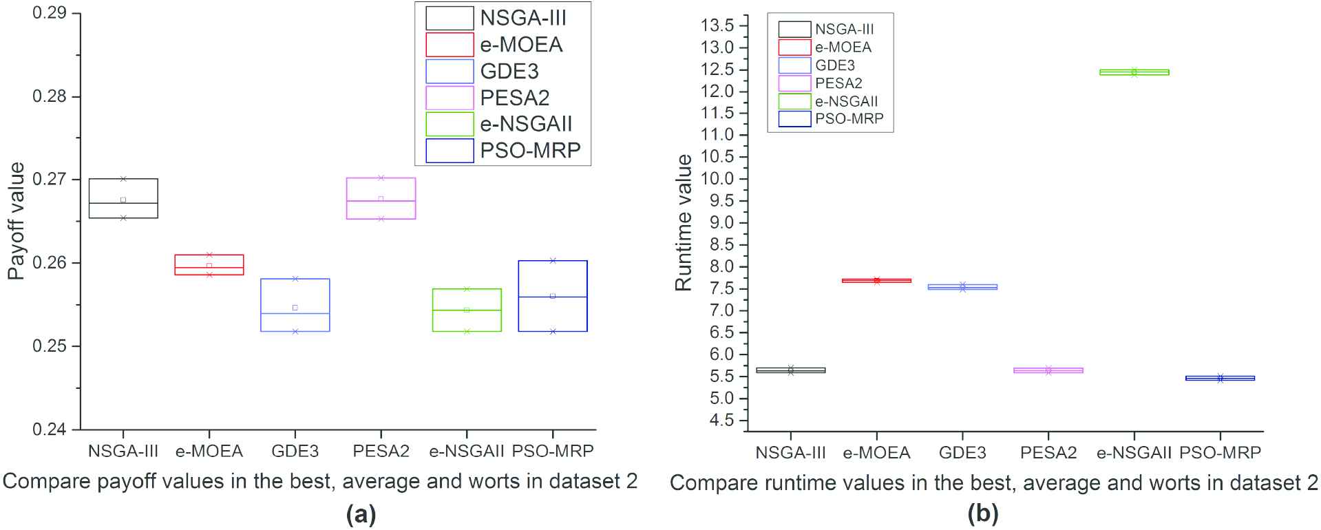 From the experimental results in Tables 4 and 5, the ϵ-NSGA-II algorithm gave the best results with 2 data sets; otherwise, PESA2, NSGA-III, and PSO-MRP had the fastest running times. In addition, we have some comments and evaluations, as follows:
