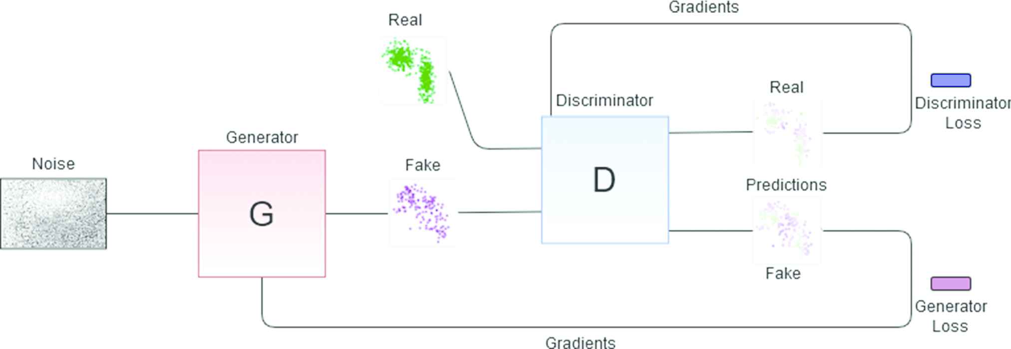 Generative adversarial network (GAN) architecture for obtaining one of the discriminant elements. The red block represents the generator net which generates fake data that is passed to the discriminator (blue block). The latter decides what is true and what is false from the input data and the gradients are adjusted according to the true labels until a discriminator that knows exactly what type of arrhythmia that is being trained with is obtained.