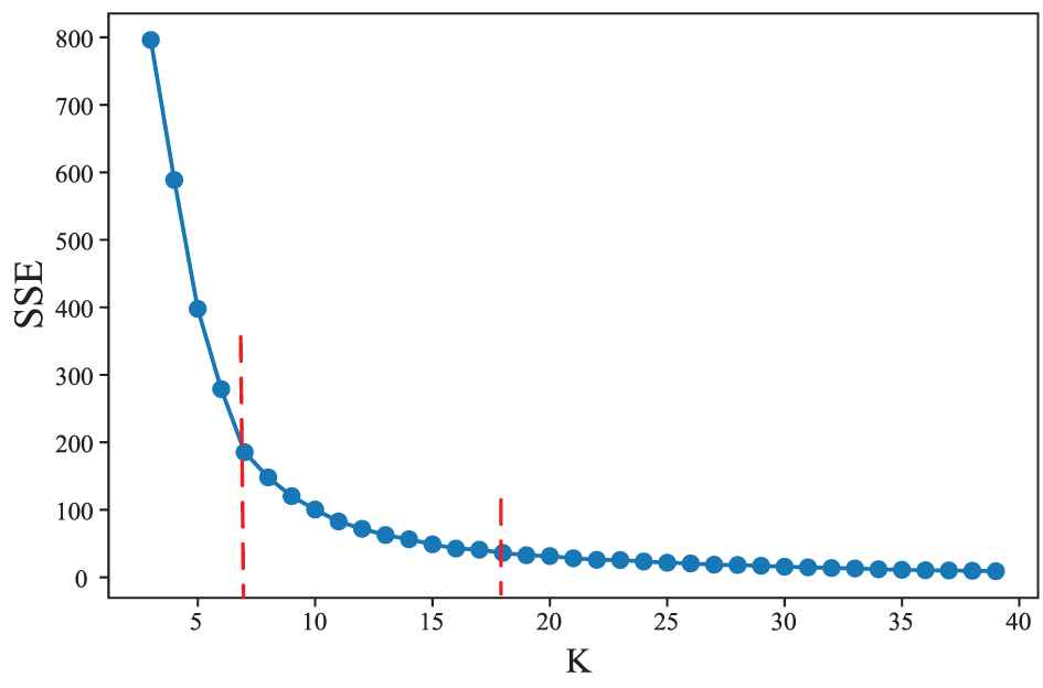 The relationship between sum of squared error (SSE) and the number of clusters K. SSE always decreases with an increase in the cluster number K. For some K, the change of SSE is significantly different before and after them. We choose K with the largest change as the optimal number of clusters.