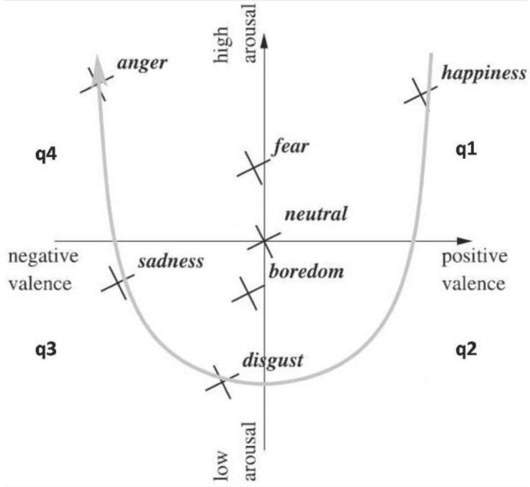 Valence/arousal model of emotion classes for the Emotion Database (EMO-DB) [20]. Figure adapted from [8].