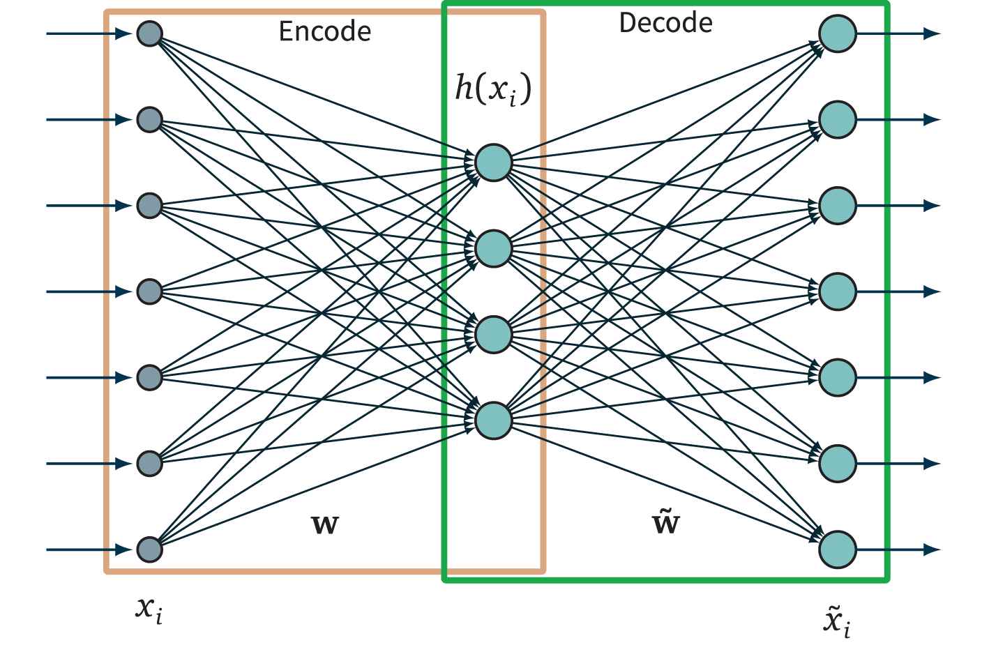 As shown in Figure 3, a simple autoencoder has only one hidden layer. It is therefore parameterized by weights (wmxn, w̃nxm) and biases (b,b̃m), as follows: