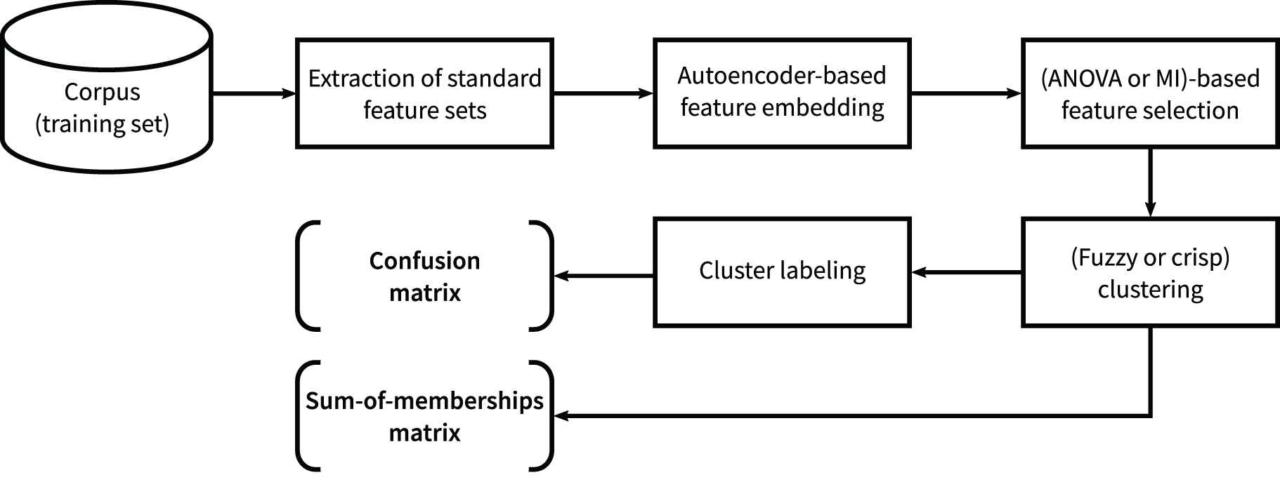 The methodologies adopted include (a) combined techniques of features analysis, i.e., feature embedding by autoencoders and feature selection by analysis of variance (ANOVA) or mutual information (MI); (b) different clustering methods, such as crisp clustering using K-means, and fuzzy clustering using probabilistic, possibilistic and graded-possibilistic c-means; (c) a novel way to analyze emotion recognition using the sum-of-membership matrix, which is made possible thanks to the use of a possibilistic-type fuzzy clustering, as will be detailed hereafter.