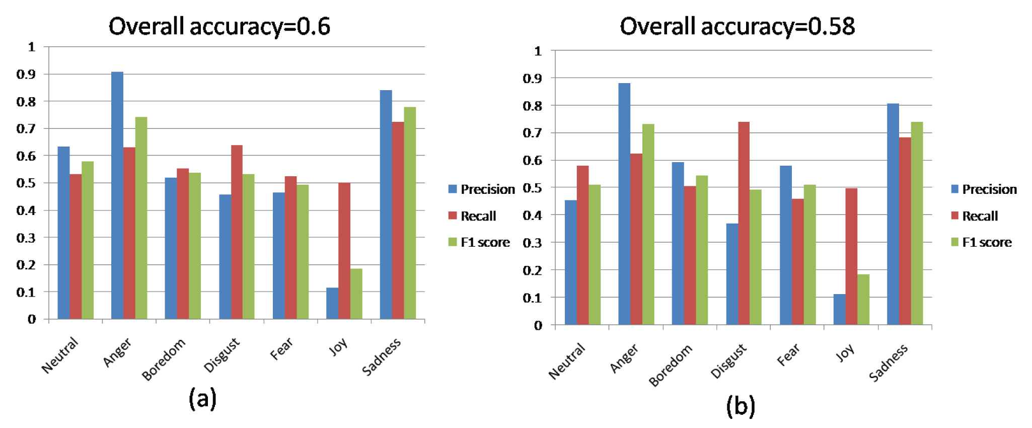 Finally, though emotion classes are balanced in the EMO-DB database [20], the differences between classification results may be due to the choice of features. Though we opted for a standard feature set, that has been successfully used for Interspeech'09 emotion recognition challenge [21], it looks less efficient to detect all emotions equally. Another interpretation could be that some intense emotions, such as joy, may share a lot of their aspects like valence and arousal, and hence have similar features as other emotions that have similar levels of valence or arousal, such as anger.