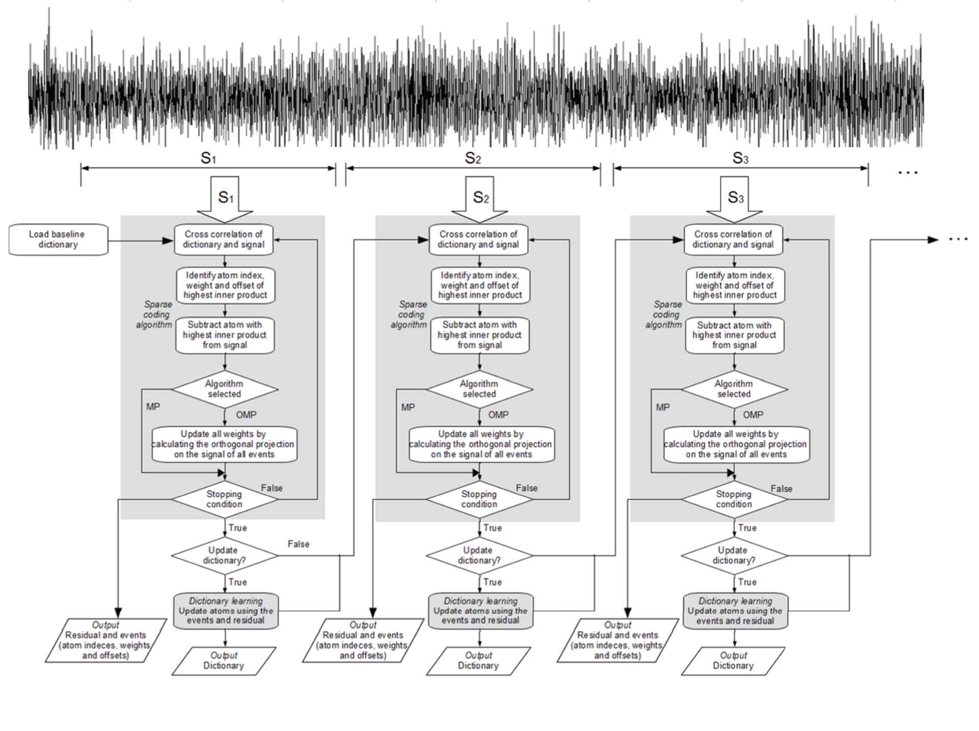 Step 1 is a convolutional sparse coding [32] process repeated until a stopping condition is reached. Typically, the stopping condition is defined in terms of the total number of terms N of the approximation, as in this case; alternatively, this condition can be defined in terms of the approximation error or signal-to-residual ratio. By defining the stopping condition in terms of the number of atom instances, the sparsity of the model in Eq. (1) is directly related to the number of iterations of the optimization process; hence, the computational requirements for online operation are well defined. This step tends to be computationally demanding but the computational cost will remain the same for each consecutive segment while the optimization parameters are not modified. Furthermore, real-time processing of signals might be possible with a new generation of processors, such as the Arm Ethos-N57 [33]. The Arm Ethos-N57 possess a performance of up to 1 TOP/s, which is at least one order magnitude above the number of operations carried out on the scheme proposed here. Step 2, the dictionary update, is performed iteratively after the sparse coding of each signal segment. The process continues until there are no more signal segments. In this way, the online learning of atoms by processing consecutive signal segments is possible [21].