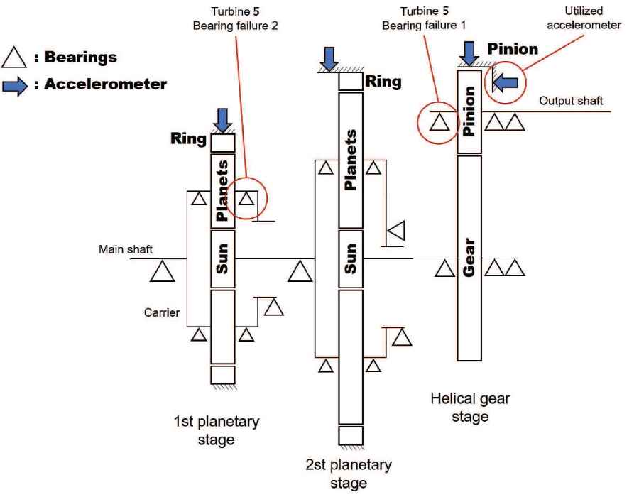 Raw time-domain vibration signals from six turbines within the same wind farm are considered in this study. All of the measurement data corresponds to the axial direction of the accelerometer, which is mounted on the housing of the output shaft bearing of each turbine. The sampling rate is 12.8 kHz, and each signal segment is 1.28 seconds long (16384 samples). The signal segments were recorded with an interval of approximately 12 hours over a period of 46 consecutive months in the last decade. In this period of time, five turbines remained healthy, which will henceforth be referred to as Turbine 1, Turbine 2, Turbine 3, Turbine 4, and Turbine 6. The other turbine, which we refer to as Turbine 5, had two bearing failures in this period. The locations of the defective bearings are highlighted in Figure 2. The descriptions of the failures are as follows: