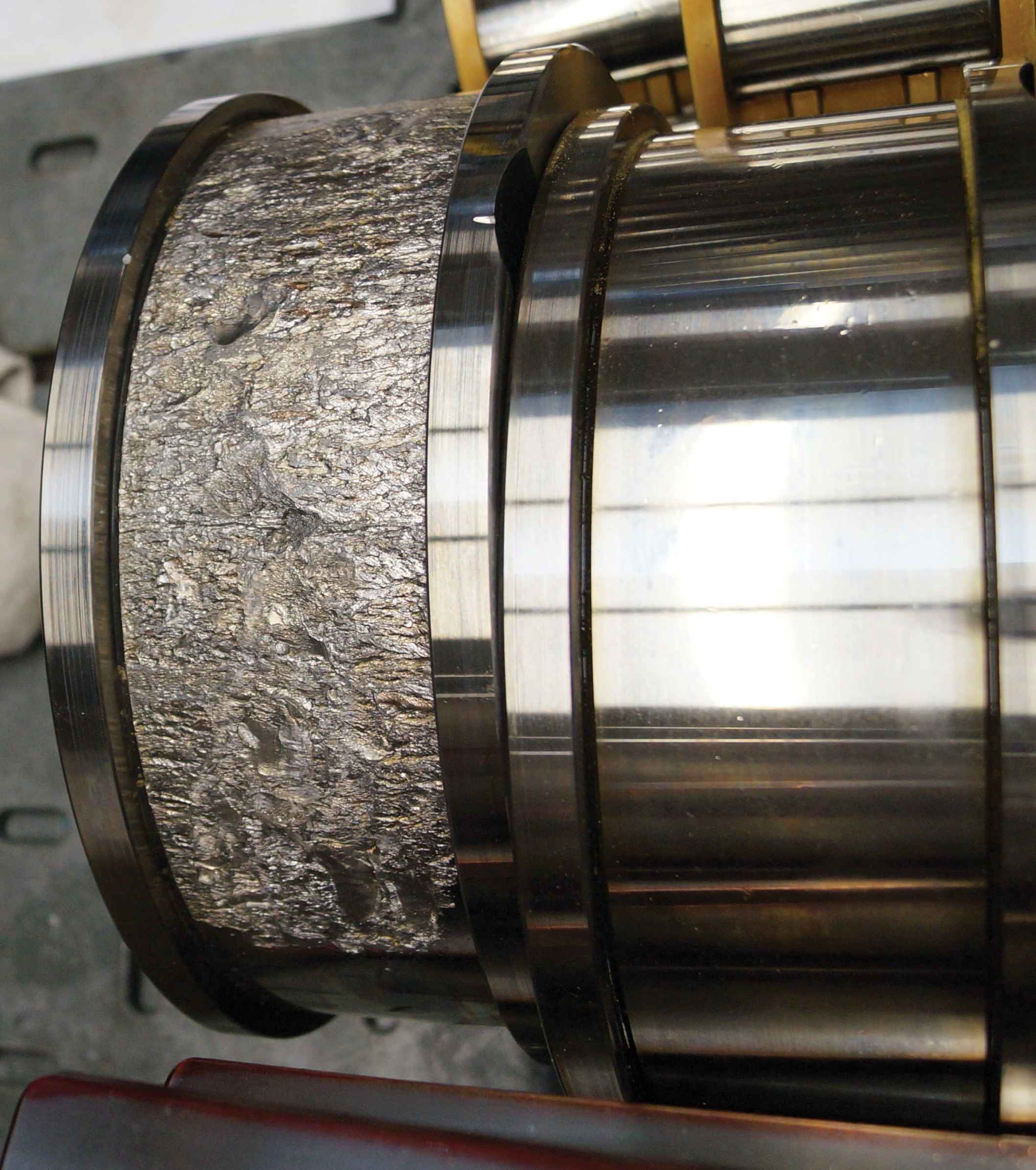 End result of the inner raceway failure of the bearing supporting the gearbox planets in Turbine 5 (left). Inner raceway of a healthy bearing included for comparison (right).