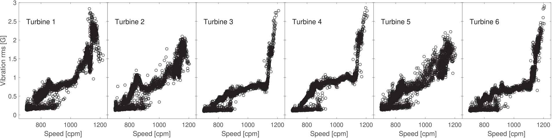 The dataset containing the raw time-domain vibration signals and speed measurements from the six turbines is publicly available; see Appendix for further information.