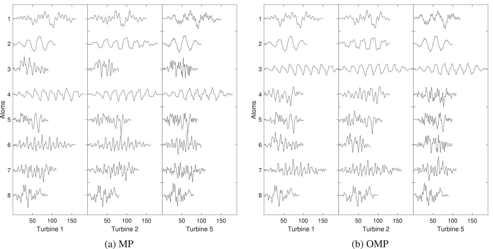Figure 6 shows that the difference in fidelity obtained with the two algorithms is negligible. A decrease in the fidelity of the signal model for Turbine 5 when the HSS bearing is replaced at the beginning of the first year of operation is observed in both cases. The update of the propagated dictionary depends on the selected sparse coding algorithm, which consequently affects the calculated dictionary distance. Figure 8 shows that the dictionary distance distribution is wider under normal operating conditions in the case of the OMP algorithm compared to the MP algorithm. Considering the higher computational cost of the OMP algorithm, these results indicate that there is no evident benefit to using OMP for the calculation of dictionary-learning-based condition indicators and that MP-based indicators (for unknown reasons) may be beneficial for anomaly detection.