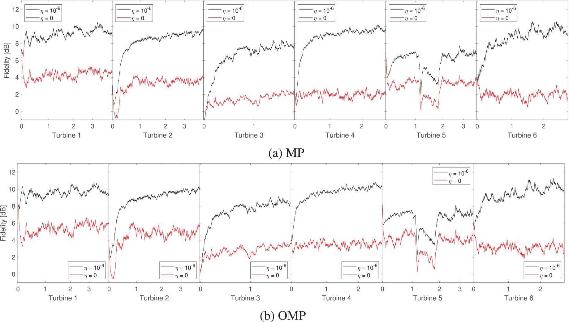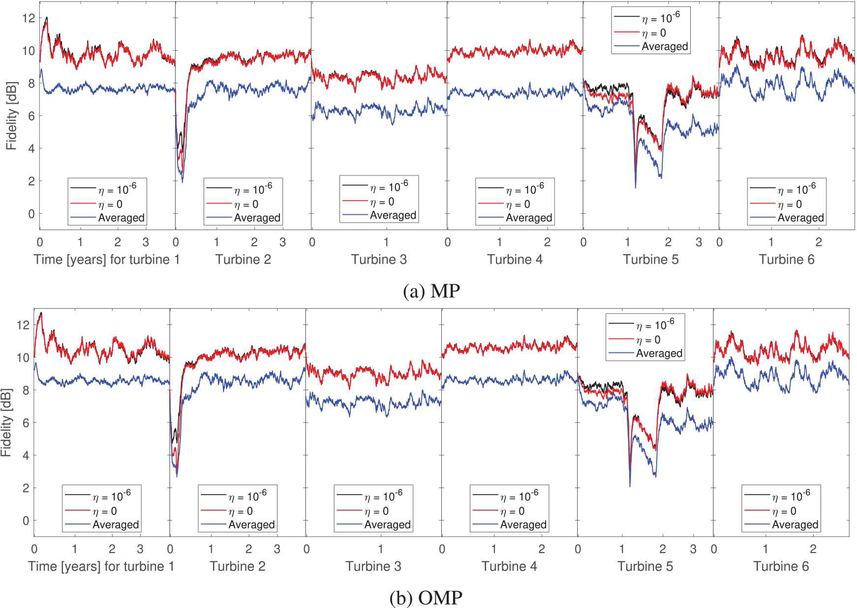 Next, two additional cases are considered where the baseline dictionary is learned from another machine. In these cases, the vibration data were obtained from the ball-bearing data center [40] at CWRU. The fidelity of these two cases using the MP and OMP algorithms is shown in Figure 7. Each algorithm has two cases: η=106, indicating when the baseline dictionary is propagated, and η=0, which occurs when the baseline dictionary is used as is and without further adaptation. Under the two algorithms, the fidelity in the η=106 case increases with time and reaches a similar level as in Figure 6 at the end of the time period, which is to be expected since the atoms in the dictionary are adapted to the signal. The CWRU baseline dictionaries cannot adequately model the wind turbine signals, resulting in a lower fidelity in the case of η=0 compared to the fidelities in Figure 6. However, note that the replacement of the output shaft bearing and gearbox in Turbine 5 are still associated with abnormally low values of the fidelity.