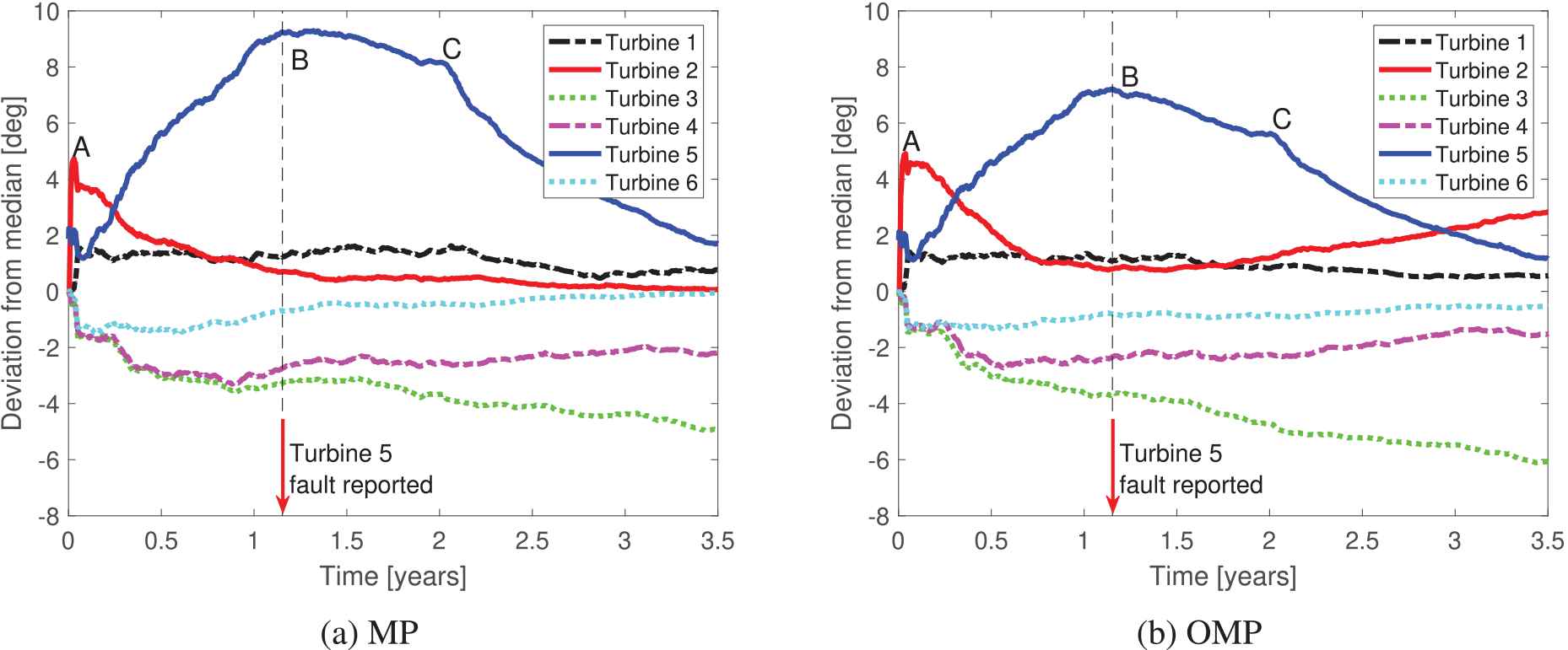 Figure 9 shows the MAD values of the dictionary distance shown in Figure 8. The MAD highlights a significant deviation of Turbine 5 in a period that extends approximately eight months earlier than the date when a fault report was filed for the turbine. The fault report for Turbine 5 was filed 1.2 years after the start of the vibration data recording. The trend of Turbine 3 deviates from the other turbines at the end of the recorded time period for both sparse coding algorithms. This deviation may be due to the geographical location of Turbine 3, which is the farthest away from the other turbines. The MAD values at times of interest when Turbine 2 had the electrical fault (point A) and Turbine 5 had the HSS bearing replaced (point B) and the gearbox replaced (point C) are shown in Table 4 for the MP case and Table 5 for the OMP case. The largest values are highlighted in bold and correspond to the periods of interest.