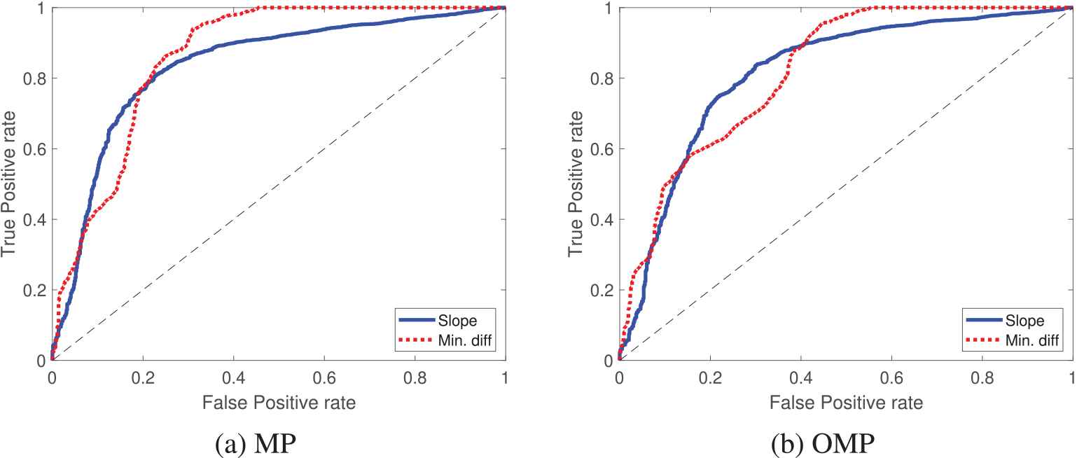 Figure 10 shows the ROC curves for two indicators based on the dictionary distance of the two sparse coding algorithms presented in Figure 8. One of the ROC curves is based on the slope of the dictionary distance versus time, and the other ROC curve is based on the minimum difference between the distance for one turbine compared to the distances for the other five turbines. The slope-based indicator gives a balanced ratio of the number of true positives to false positives. The minimum difference indicator is slightly skewed, which means that the indicator makes positive classifications with weak confidence since it classifies all positives correctly for false-positive rates above approximately one half. The indicators based on the MP algorithm cover a larger area than the results obtained with the OMP algorithm. This behavior corresponds to higher classification accuracy at a lower computational cost. Label B in Figure 8 marks the time of the bearing replacement in Turbine 5, while label A indicates the resolution of a suspected electrical issue that was introduced during the installation of the sensor system in Turbine 2. In the ROC analysis, we consider the data from Turbine 1, Turbine 3, Turbine 4, Turbine 6, and the data from Turbine 2 after time A as data that correspond to healthy states of operation. Furthermore, the data from Turbine 5 after the gearbox replacement at C are also considered as data that correspond to healthy states of operation. The data from Turbine 5 before C and the data from Turbine 2 before A are considered as data that correspond to faulty states of operation. The classification results used in the calculation of the TPR and FPR are defined by varying the threshold values of the slope-based and minimum difference indicators.