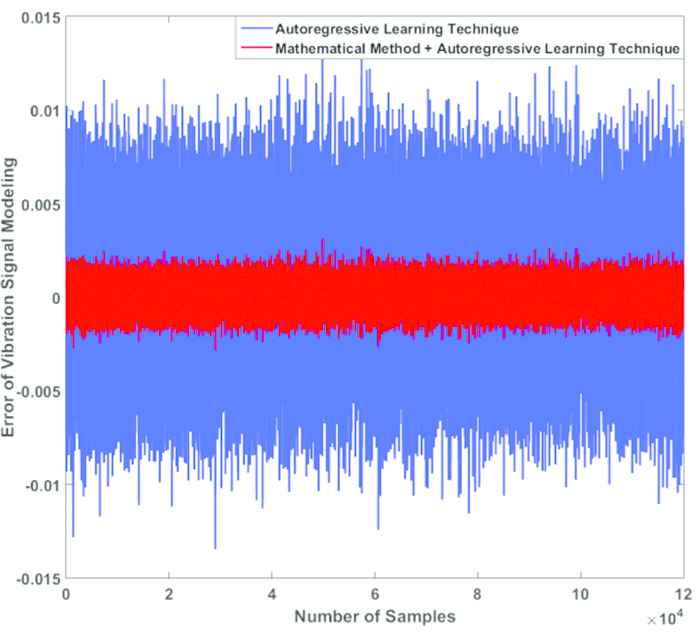 Error of bearing modeling using autoregressive learning technique and the combination of mathematical system modeling and autoregressive learning approach.