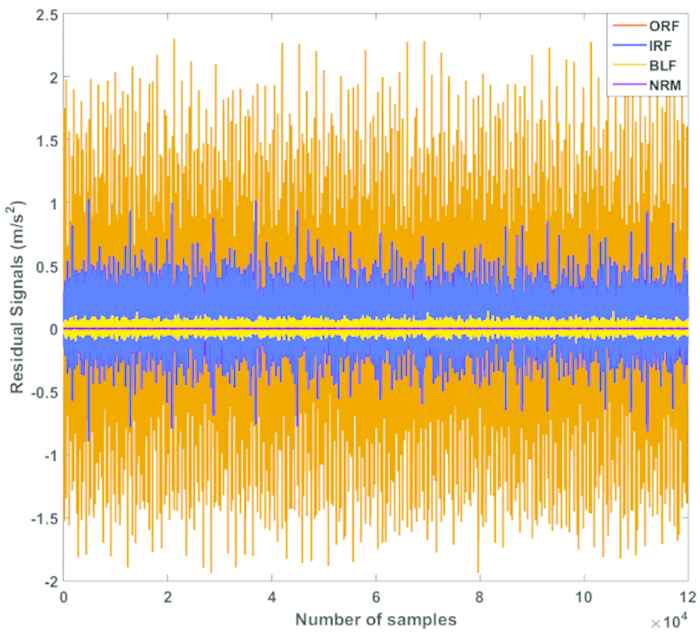 To test the power of fault detection and identification, the CWRU dataset is used in this work. This vibration dataset has four classes: NRM, BLF, IRF, and ORF. Table 3 shows the window characterizations for estimated and verification signals from the CWRU bearing vibration dataset. Figure 5 illustrates these classes when the torque load and crack size are 0-hp and 0.007-inch, respectively.