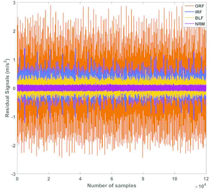 After resampling the residual signals of the bearing, statistical features such as the RMS are extracted from the resampled residual signals. The following equation represents the RMS of the residual signals: