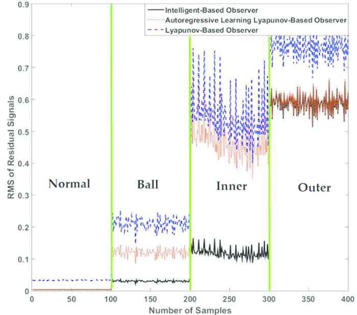 Root mean square (RMS) of residual signals using proposed intelligence-based observer, autoregressive learning Lyapunov-based approach, and Lyapunov-based technique.