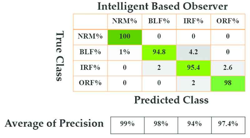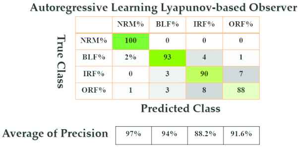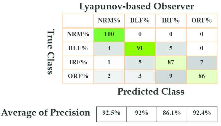 As shown in these figures, the classification accuracy for the proposed algorithm (intelligence-based observer) is better than those of the other two methods. The main problem of fault identification in the autoregressive learning Lyapunov-based approach and Lyapunov-based technique is related to anomaly identification for inner and outer defects.