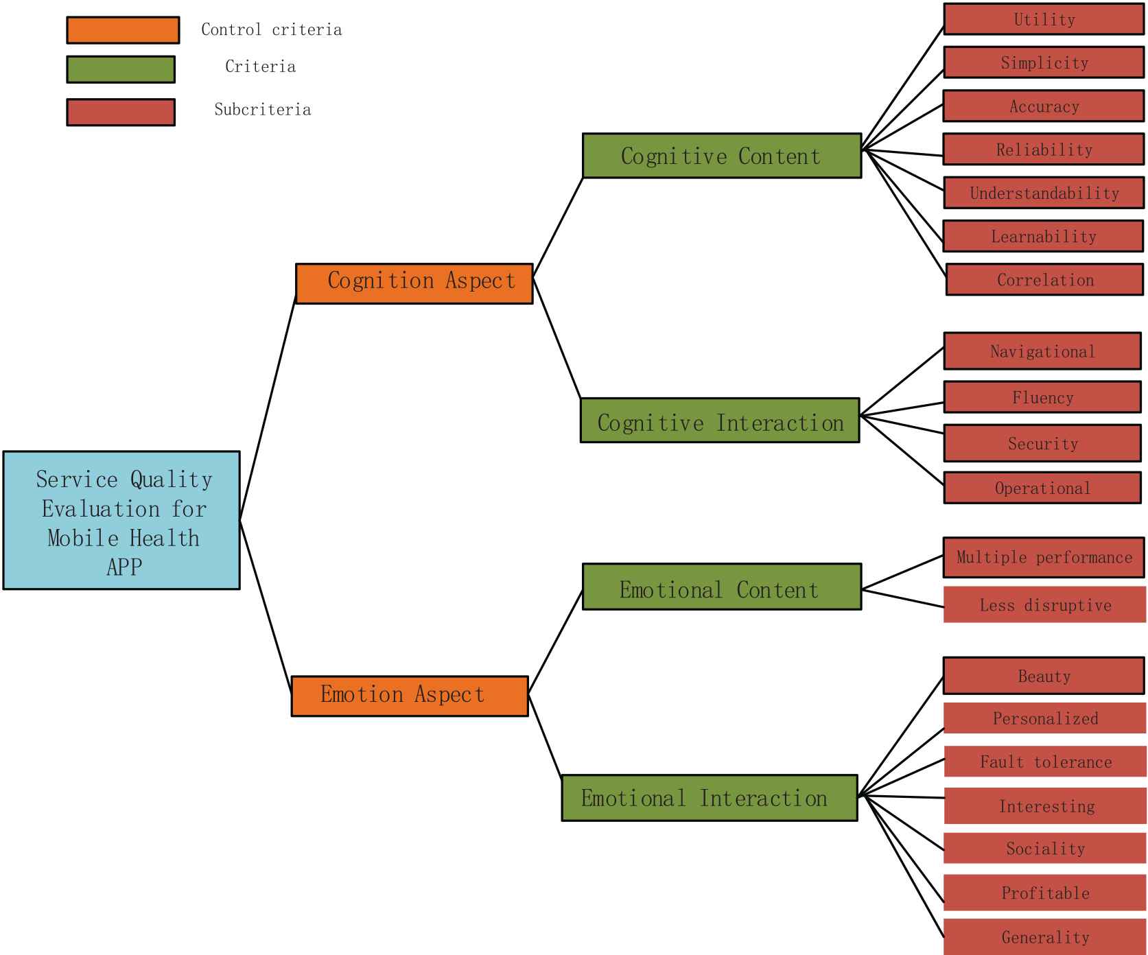 In this paper, Figure 2 shows the evaluation concept tree of this study. The root node of the evaluation concept tree has two sub-evaluation categories (based on cognition and based on emotion), which contain different sub-evaluation categories. These two indicators were chosen because of what Christina Chick CF found in his research that clinical research across the developmental spectrum increasingly reveals the nuanced ways in which emotion and cognition can work to either support or derail rational (i.e., healthy or goal-consistent) decision making [26]. Weights start at the root node and are distributed layer by layer to the lower nodes and end at the leaf node. Different weight distribution of evaluation factors reflects different evaluation standards of users. Since different types of mobile health applications have different evaluation concept trees, it is necessary for domain experts to customize evaluation concept trees for mobile health applications in this field.