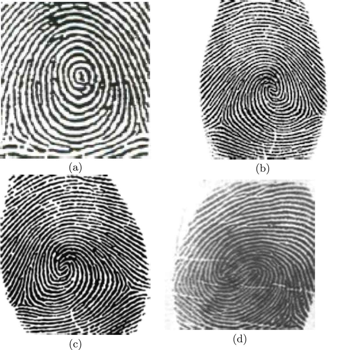 • Concentric whorl, this pattern represents the most basic form of a whorl in which the core is circular or elliptical in the center of the fingerprint, see picture (a) in Figure 1.