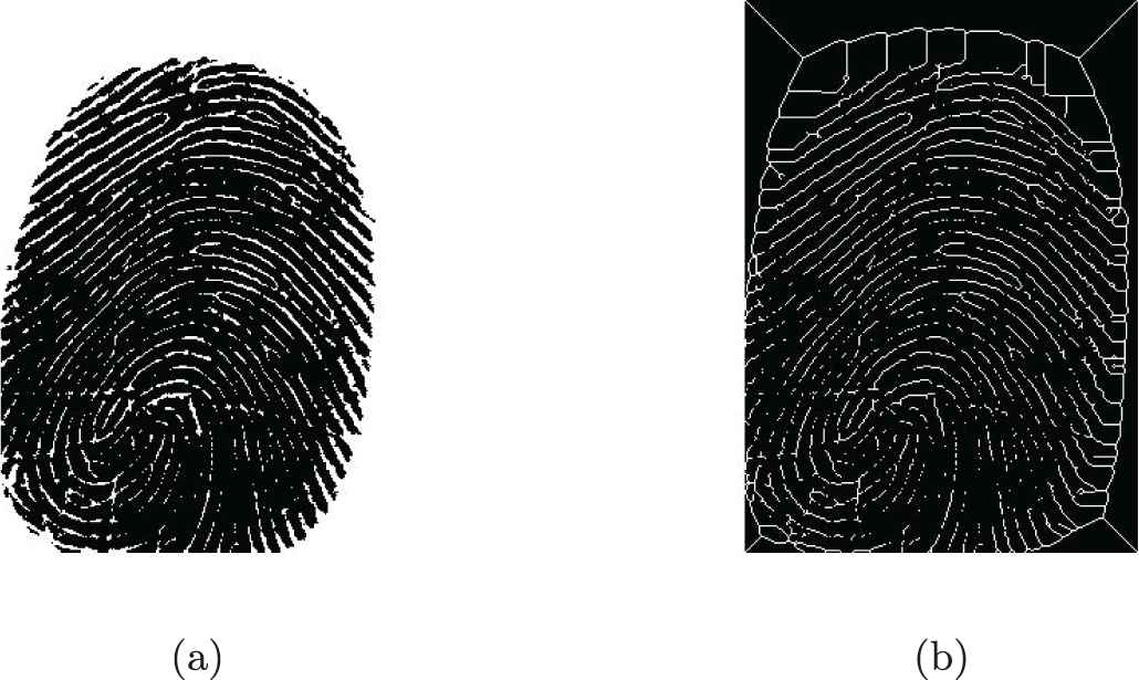 Many fingerprint classification algorithms were developed [716]. Among these, the usual features used are singularities and orientation image information, the combining of these features is common. In Dass and Jain [17], a manual fingerprint classification was performed by inspecting the geometric characteristics of major ridge curves in a fingerprint image called orientation field flow curves (OFFCs). Lately, a method has been presented for the detection of a fingerprint's reference point by analyzing fingerprint ridges curvatures, see [18], in which the total execution times of the most important stages was 143 ms. In Castillo-Rosado and Hernández-Palancar [19], a new fingerprint feature has been introduced, named Distinctive Ridge Point (DRP), combined with an improved triangle-based representation which also used minutiae. This technique needs to decrease the ridge points dependence with minutiae to get better results. Recently, a model of receiver operating characteristic (ROC) curve has been proposed, which depended on a weighted empirical process to jointly account for the order constraint and within-cluster correlation structure, see [20]. In such way, the statistical testing for performance fingerprint matching data needs more time complexity. In Gupta et al. [21] a novel technique has been proposed which considered the minutiae density and the orientation field direction for the reconstruction of the fingerprint, but the suggested method for orientation field reconstruction only considered the local orientation pattern.