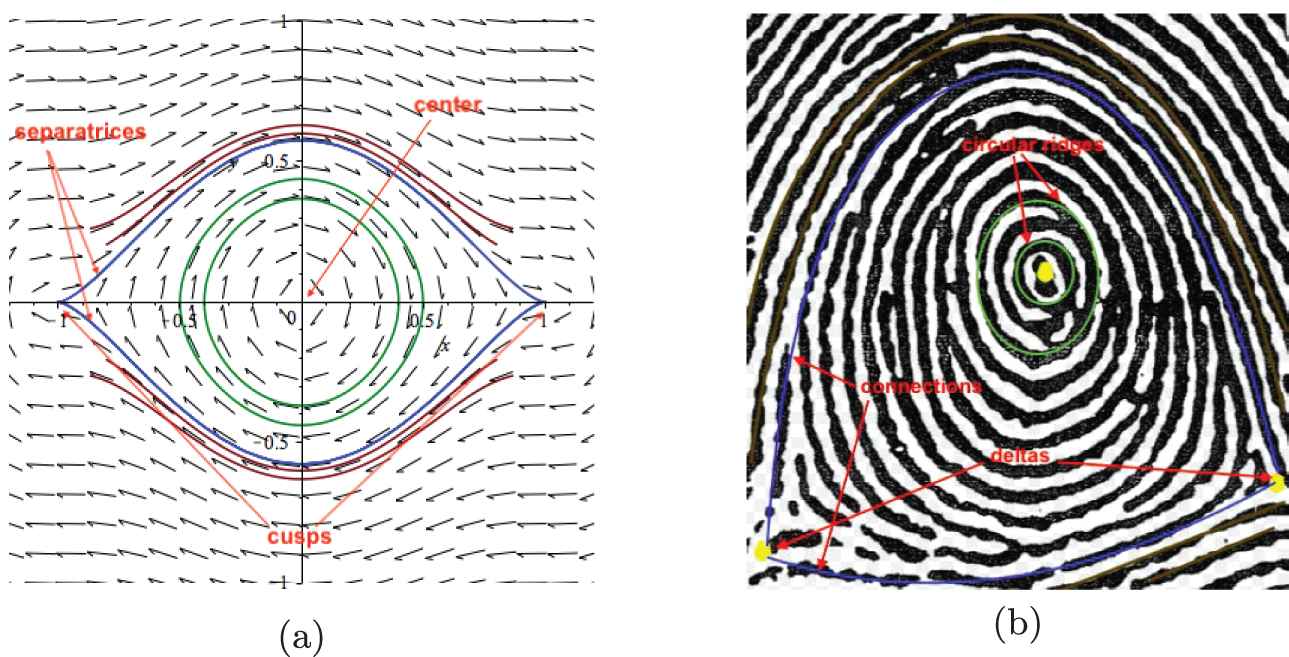 Figure 3 shows the phase portrait of the system (14) using Maple and the image that represents the concentric whorl. It easy to compare and matching center with circular ridges in the middle, the cusps with the deltas, and the separatrices with the connections in both pictures.