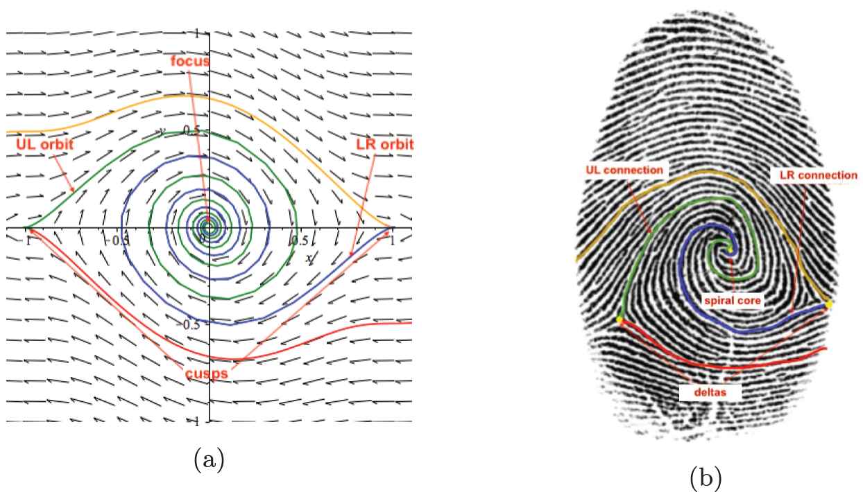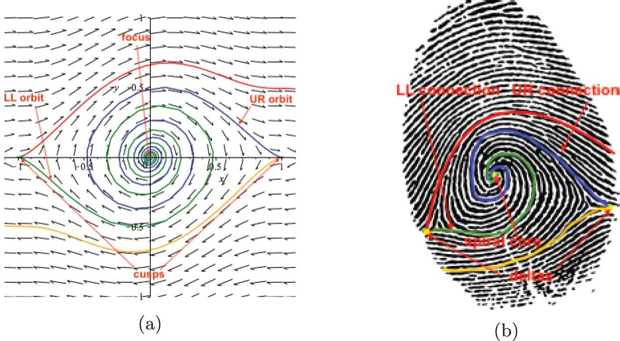 Simulation of the upper right-lower left (UR-LL) spiral whorl fingerprint: (a) phase portrait of the system (15) and (b) image [5] of the UR-LL spiral whorl fingerprint.