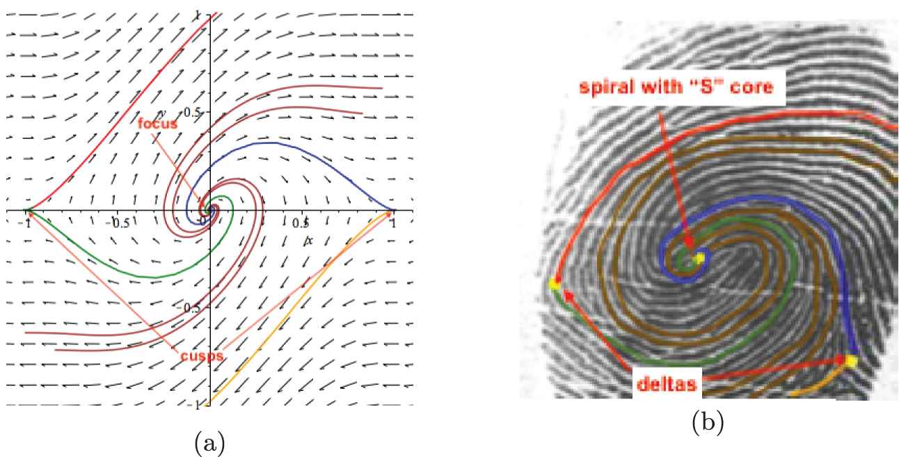 A Few studies talked about mathematical modeling of the whorl fingerprint specially using the phase portraits of a system of differential equations. The idea of phase portraits in texture modelling can be seen in [22] where a characterizing oriented patterns was proposed using the qualitative differential equation theory to analyze real texture images, but no fingerprint image seems to have been considered. In the thesis by Ford [23], the complex flows were divided into simpler components which are modeled by linear phase portraits and then combined to obtain a model for the entire flow field, this idea was applied to fingerprints in [24].