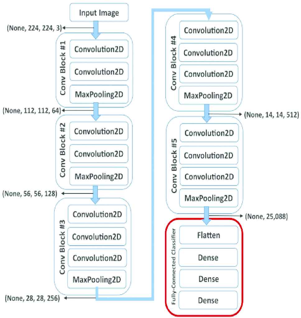 VGG16 uses 3 fully connected layers and 16 convolutional layers. on more than a million images, VGG-16 is trained and can classify images into 1000 object categories. All convolutional layers in VGG16 are 3 × 3 convolutional layers with 2 × 2 pooling layers with a stride size of 2 and a stride size of 1 and the same padding [31]. The feature map size is reduced by half after each pooling layer. The last feature map before the fully connected layers is 7 × 7 with 512 channels and it is expanded into a vector with 25,088 [32]. Figure 8 shows Block diagram of VGG-16 network by three fully connected layers [33].