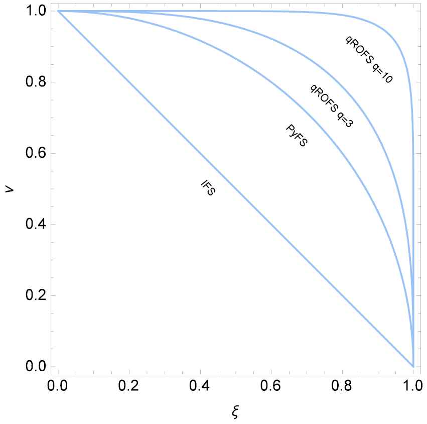 Yager introduced the concept of q-rung orthopair fuzzy set (qROFS) as a generalization of both IFSs and PyFSs [9,10]. The condition for the membership ξ and nonmembership ν functions is 0ξq+νq1 where q1. In Figure 1, the set of order pairs available for membership and nonmembership grades for qROFSs are displaced.