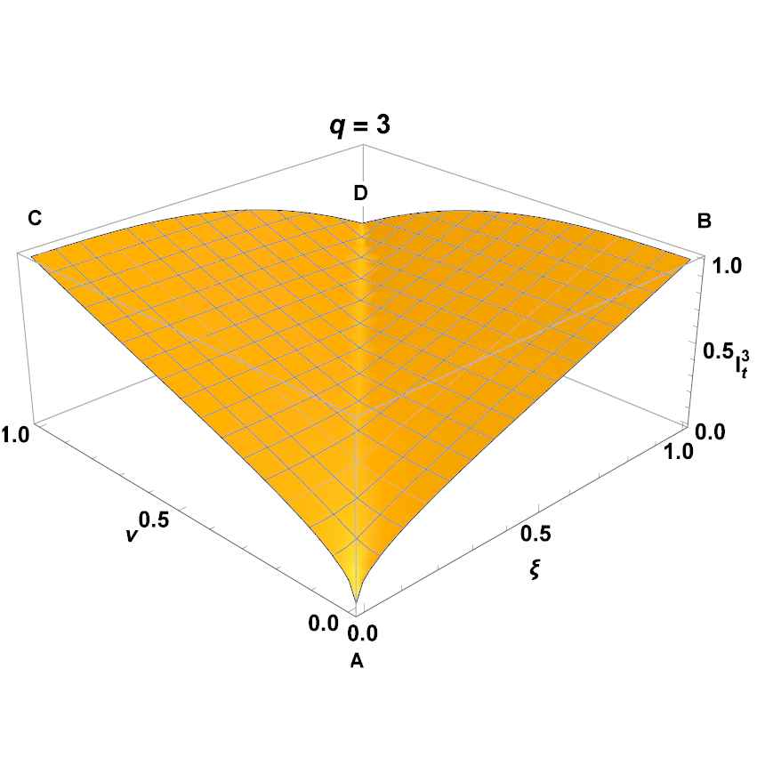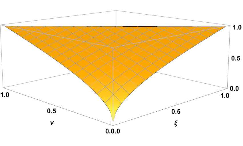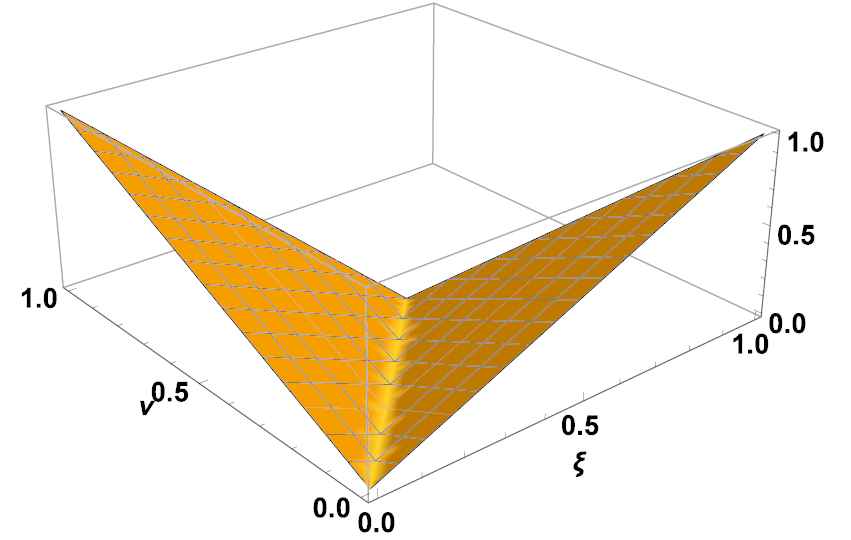The graphical representation of both parts displaced in Figures 2 and 3. It can easily be seen from Figure 2 that the first part have value one two times for crisp cases and remains zero for ξ(t)=ν(t). While the second part displaced in Figure 3 and touches zero at (0,0). The graph remains maximum one for (ξRq(t)+νRq(t))=1.