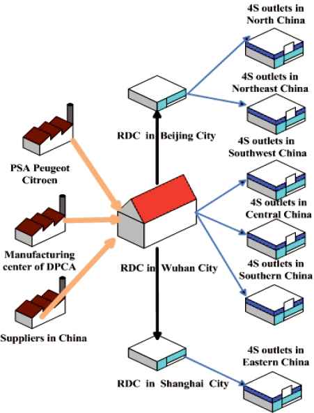 In practice, companies often use a JRD policy to earn larger profit. In 2013, as a branch of GEFCO (or “les Groupages Express de Franche Comté”, in French), Europe’s leading automotive industrial logistics service provider, Wuhan Dongfeng GEFCO Logistics Ltd. (WH-GEFCO) established a logistics partnership with Dongfeng Peugeot Citroen Automobile Co. Ltd. (DPCA) for an automobile spare parts regional distribution center (RDC) in Beijing City. As shown in Fig. 1, different kinds of spare parts from different suppliers are transported to a central warehouse in Wuhan City, and thereafter are transported to the RDC in other cities. Then, WH-GEFCO transported spare parts to more than 200 4S outlets. The deputy manager of DPCA said that the JRD policy was able to improve efficiency and reduce considerable cost.