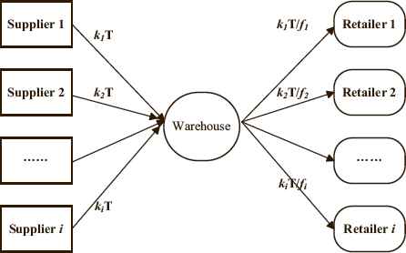 A JRD problem with trade credit, which is composed of a warehouse, n suppliers, and n retailers is considered as shown in Fig. 2. The warehouse replenishes multiple items from upstream suppliers to meet the demands of the retailers. The JRD policy aims to determine the replenishment frequencies and delivery frequencies of items to minimize the total system cost.