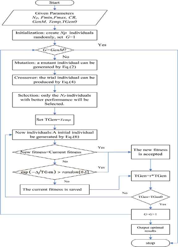 The improvements are as follows: (a) we use SA to optimize the result obtained by HDE to overcome the shortcoming of one-to-one competing in the typical DE; and (b) the adaptive mutation factor F can maintain the balance between exploring and exploiting abilities. The main processes of HDE-SA are discussed as follows.