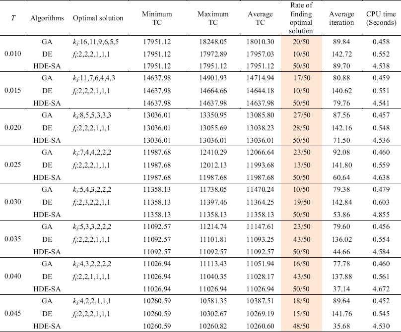 Table 10 shows that HDE-SA outperforms DE and GA in terms of accuracy and robustness. (a) The rate of finding an optimal solution with HDE-SA is higher than that for DE and GA, and the average iteration of convergence with HDE-SA is lower than that for DE and GA. Specifically, the convergence rate is 100% when n<20. In fact, the items that are jointly replenished are smaller than 20. (b) When n increases, the best TC and average TC obtained by HDE-SA is always better than that obtained by DE and GA. (c) Although HDESA is slower than DE and GA, the CPU time is acceptable for practical application.