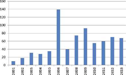 Unlike strict mathematical expression employed in optimization problem, multi-agent simulation generally adopts a set of rules. Thus, it has the potential to shorten the simulation process to save computational time by coordinating the tasks among the agents. Agent-based modelling methodology has a long lineage, beginning with von Neumann’s (16) work on self-reproducing automata. Agents are “objects with attitudes” (17). A collection of agents, programmed to follow some (often very simple) behavior rules, can form Multi-Agent Based Modelling (M-ABM) (18). Compared to analytical method and general discrete-event simulation, M-ABM has less complexity, as it focuses more on the objective of each agent rather than the achievement of system objective. Aside from the computational efficiency, it features with a simpler operation process, as we only need to answer a number of “what-if” questions by a number of “if-then” rules (19). These advantages make M-ABM’s application increasingly popular in the field of traffic-control field. Adopting combined key words of “agent simulation” and “traffic control”, this study searched a large number of academic papers in Google Scholar. The corresponding number change is illustrated in Figure 1, where upward trajectory is merging in recent years especially after Roozemond (2001)’s pioneering work (20). The reason of the sharp increase in the years 2006–2009 is that some agent-related conferences concerning traffic control problem were held in those years. Some typical applications of M-ABM in traffic control are summarized: self-organizing traffic lights (21–22), fuzzy multi-agent signal control (23–24), and multi-agent model predictive control (25). Few studies in regard to the combination studies of multi-agent traffic control with evacuation route choice can be found in the literature. The relevant literature is listed in Table 1, where vehicle movement is based on existing simulation approach. And most route-choice behavior is quite simple. Some uncertain influencing attributes in evacuation are thus not considered. Moreover, the traffic control strategy cannot respond to oversaturation conditions except for the literature (26). The throttling strategy with two thresholds in Madireddy et al (2011) is useful to modify the excessive state switching problem in oversaturation control, but the interactions of neighbor intersections are not considered in this strategy.