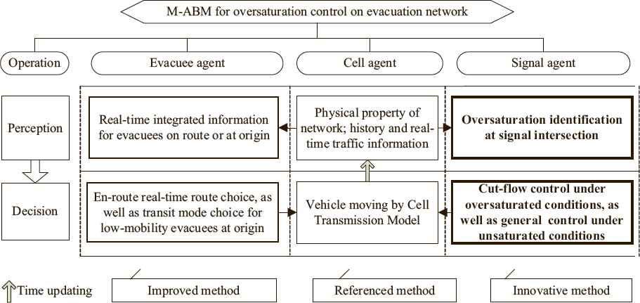 When modelling multiple agents, two requirements should be met: (1) each agent needs to be endowed with specific capability of perception and decision making; and (2) the coordination mechanism among the agents needs to be constructed. As the multi-agent simulation has been widely used in the field of transport-related design, three types of agents (evacuee, cell and signal) are designed and coordinated in the oversaturation control during evacuation. By simulating the interplay between agents of evacuee and signal within the evacuation network system, this study aims to obtain the optimal signal parameters serving an efficient evacuation. More specifically, this objective is achieved by optimizing the process of perception and decision making for both the evacuees’ en-route path choice behavior under uncertain traffic information and the signal optimization under oversaturated conditions, provided the definition of cell agent is known.