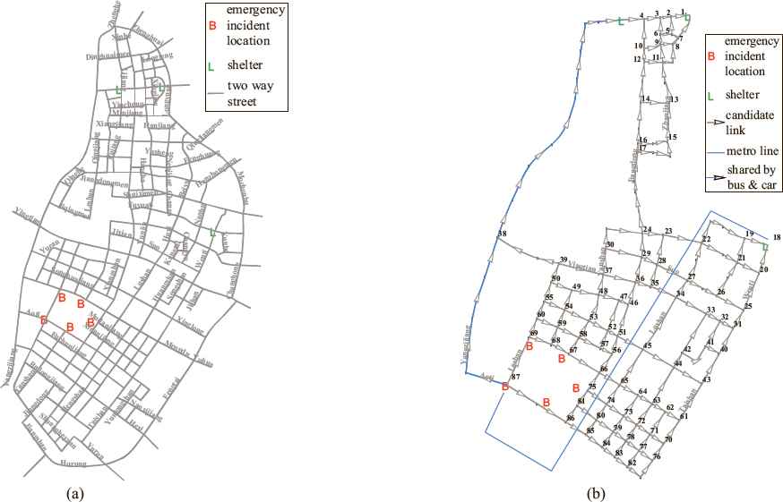 The Jianye district of Nanjing city in China has a population of 400,000 people and a total area of 80 square kilometers. Its network with 942 links and 288 nodes is shown in the left sub-figure of Figure 3. Assumed terrorist incident is forecasted in Nanjing Olympic Sports Center of Jianye which can hold 87,000 people. The five parking lots surrounding the emergency incident location are denoted by red stars (the one in the bottom-left corner is for transit), and three shelters are denoted by green circles. The shelters from west to east are called Baochuanchang Relic Site, Yueguang Square, and South Lake. The evacuation roads are organized towards north-east as shown in the right sub-figure of Figure 3. The travelers of metro, bus, and taxi are all departing from the transit parking lot. The metro line is a Z-shaped layout. The bus line is dedicated to be the blue route on the left-hand side of Fgure 3b. Taxi drivers have the same route-choice behavior with private drivers. Numbers marked near the intersections are coded in the order from shelters to the five parking lots. The signal light control is canceled in the condition of three-leg intersection. Thus, if downstream neighbor signal intersection of the three-leg intersection is oversaturated, throttling strategy will be implemented in the upstream neighbor signal intersections of this three-leg intersection. Suppose that 47,000 people escape by transit and 10,000 people leave each parking lot by car. A loading curve of evacuation demand is assumed to be approximated by the Rayleigh probability distribution function in literature (42):