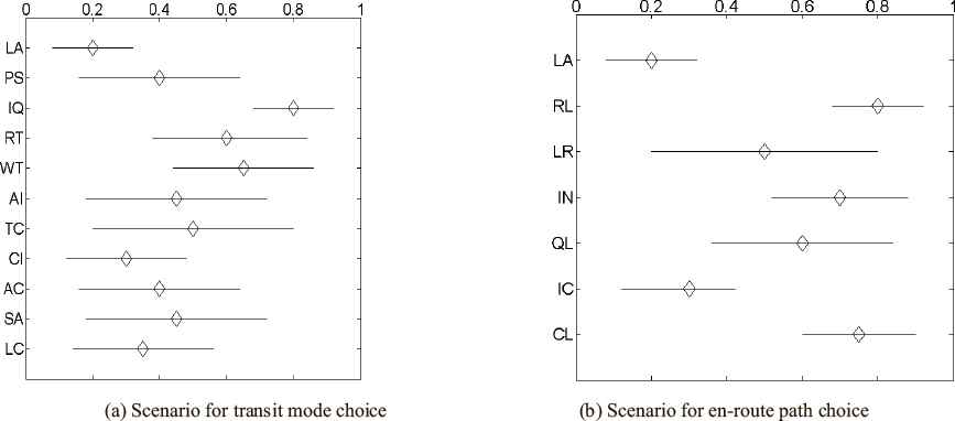 The running time within the attributes of transit modes is not used in the en-route path choice, because it is not as easy to estimate the running time of private cars as that of public transport. The cars on roads are influenced by each other. So it is hard to predict its travel time even the fuzzy value. While some transit mode such as metro has specific right of dedicated way that enables the transit mode to keep a steady running speed. Another distinction is that people by transit mode cares more about the comfort-related attributes while car driver is prone to grasping the traffic information in the evacuation network.