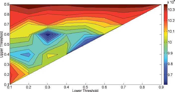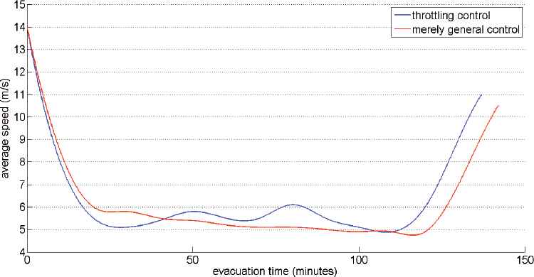 Because the change of threshold can influence the control effectiveness, we investigate the influence of various lower and upper thresholds on the total evacuation time (unit: minute) under the assumption that the median threshold is the mean of lower and upper thresholds. The influence is shown in Figure 5, where the bottom right zone is blank because the data are undesirable. Good threshold combinations are distributed around (0.3, 0.6) and (0.5, 0.5). The latter combination may lead to excessive state switching, thus we choose the former combination as a better option to test this evacuation network. The total evacuation time in this combination is 9.6 million minutes, which is reduced by 7.6% compared to the situation of no oversaturation control. The throttling strategy is implemented by software of Matlab R2013b. The total computation time of acquiring the best threshold Figure 6, where the majority of average speeds on evacuation network under throttling strategy are larger than that of original situation.