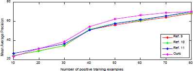 For comparison of the performance of our method against other methods, we implemented Ref.11, 12 and 13 which are other state-of-the-art concept based event recognition methods. Using the same dataset, we evaluated event classification as a function of number of positive training examples. Figure 3 shows the mean average precision over all events using the various methods. It should be noted that in all cases the parameters were tuned to obtain the best performance results.