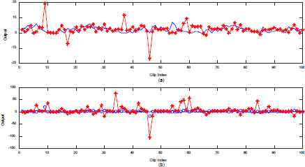 Before we begin, the fuzzy inputs and output are extracted from the annotated training videos and 50% is used for model training and the remaining 50% for model checking and validation. Figures 4 (a) and (b) are plots of the fuzzy inputs and output. Given the fuzzy inputs and output we created a FIS structure and extracted the initial fuzzy rules using subtractive clustering. Then a combination of gradient descent algorithm and least squares estimation are used to adaptively tune the parameters of the membership functions.