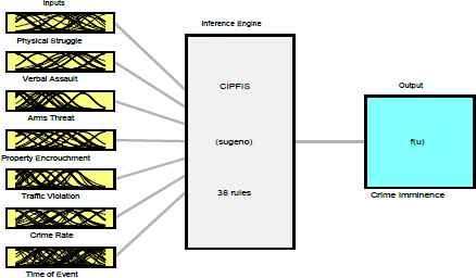 Crime Imminence Prediction Fuzzy Inference System (CIPFIS) Diagram. CIPFIS is a Sugeno-type inference system with 7 inputs, 33 rules and 1 output.
