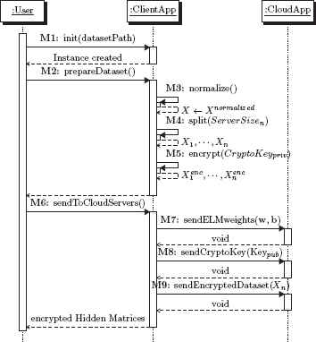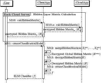 In this section, we briefly introduce our assumptions in the security model, our notations, and the sequence diagram of the overall method. In Section 4.6, we explain our proposed privacy-preserving training of the ELM algorithm in detail.