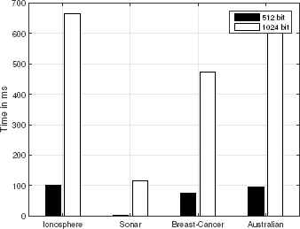 It is noted that the average training and model building time depends on the total number of instances used for classification. Fig. 4 shows the encryption time for each data set, which is affected by the number input instances and feature size. This process is computed at the client-side and can be pre-computed offline.