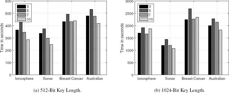 To show the training phase time performance of the proposed protocols, we tested different public data sets with parties and encryption/decryption keys that have different lengths. For the experiments, we consider four different data sets from the UCI Machine Learning Repository called Australian, Breast Cancer, Ionosphere, and Sonar. Table 5.1 shows the details of the data sets.
