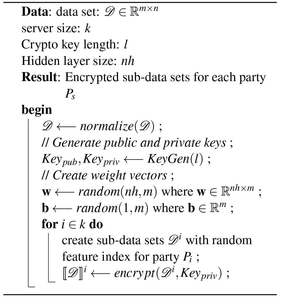 Second, the client generates public and secret keys, as described in Algorithm 1: the client generates and assigns random weights w ℝn and b ℝn, and then sends the weight vectors’ corresponding items to each Pk. Algorithm 2 shows the overall process.